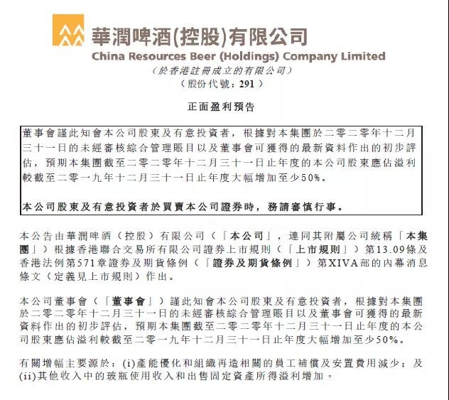 1月22日,华润啤酒发布了盈利预告,截至2020年12月31日止,公司股东应占溢利较截至2019年12月31日止年度大幅增加至少50%。