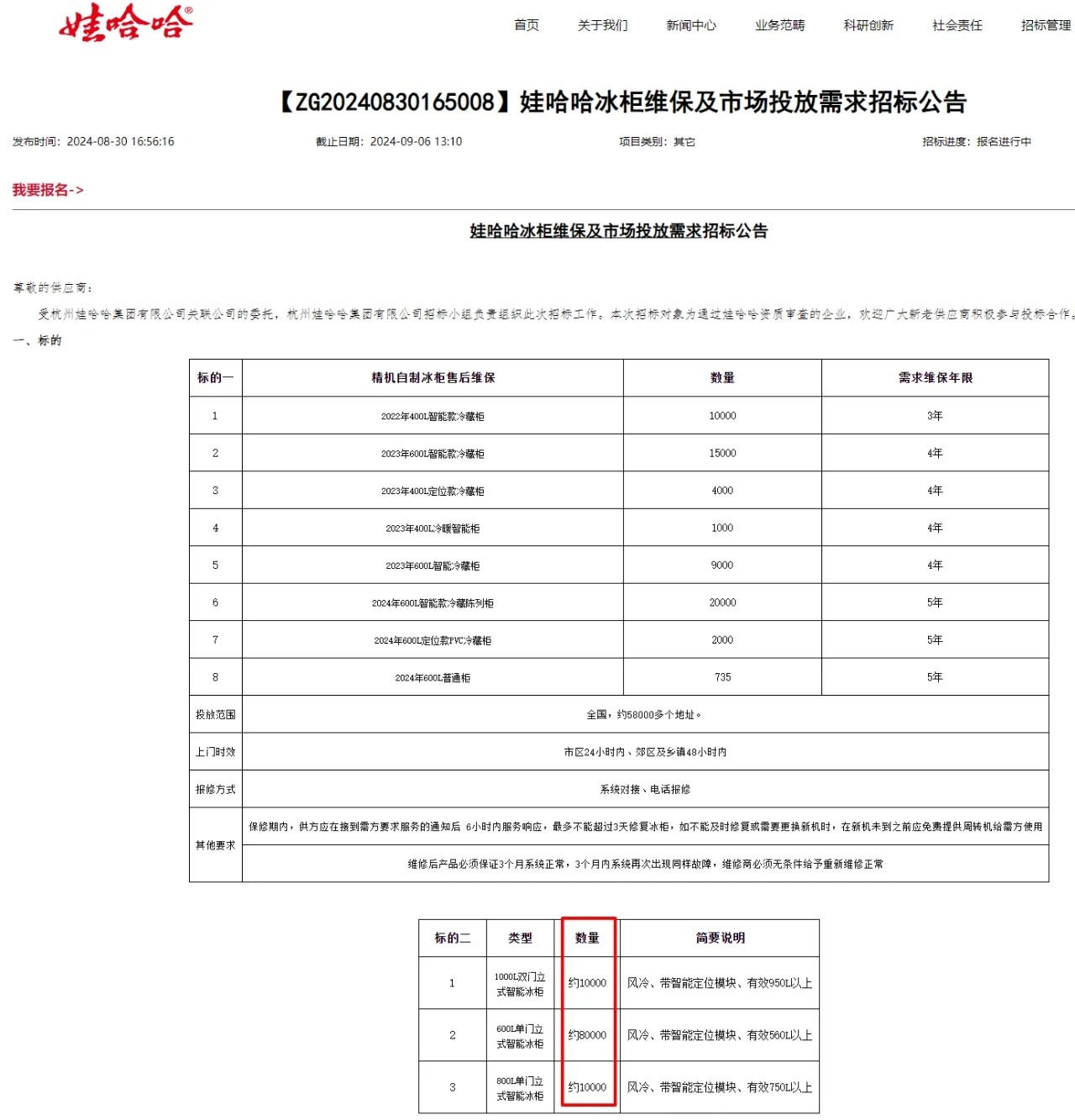 娃哈哈官网披露,当前其销售终端已超300万个。而从此次披露的招投标公告来看,娃哈哈线下冰柜的投放力度仍在持续。